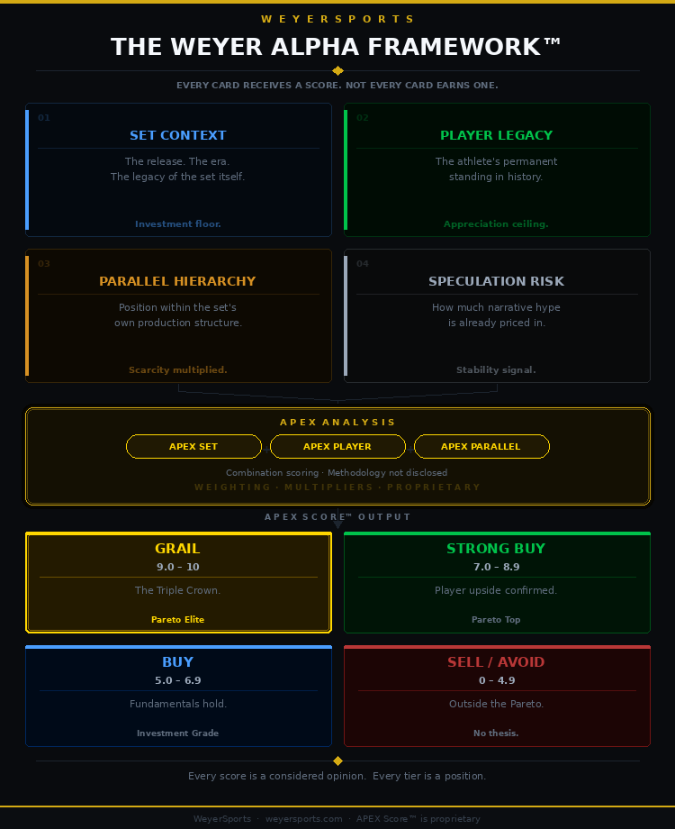Most sports card investors are making decisions based on hype, habit, or gut instinct. The Weyer Alpha Framework™ is built on something more rigorous. Every card assessed through WeyerSports is evaluated across four distinct dimensions — each weighted for its contribution to long-term investment value. The result is a single score. That score determines the tier. The tier determines the decision.